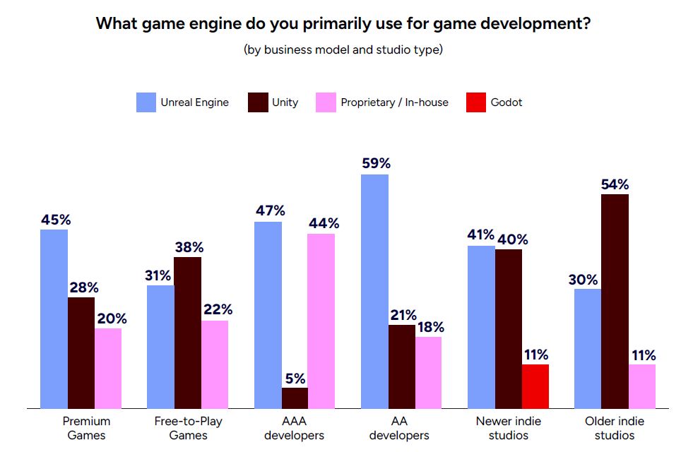 Le graphique montre également une baisse relative des moteurs propriétaires dans certaines catégories. Pourtant, cela ne signifie pas la disparition des compétences associées. Au contraire, les besoins en optimisation et en compréhension profonde des moteurs restent essentiels, même sous Unreal.
