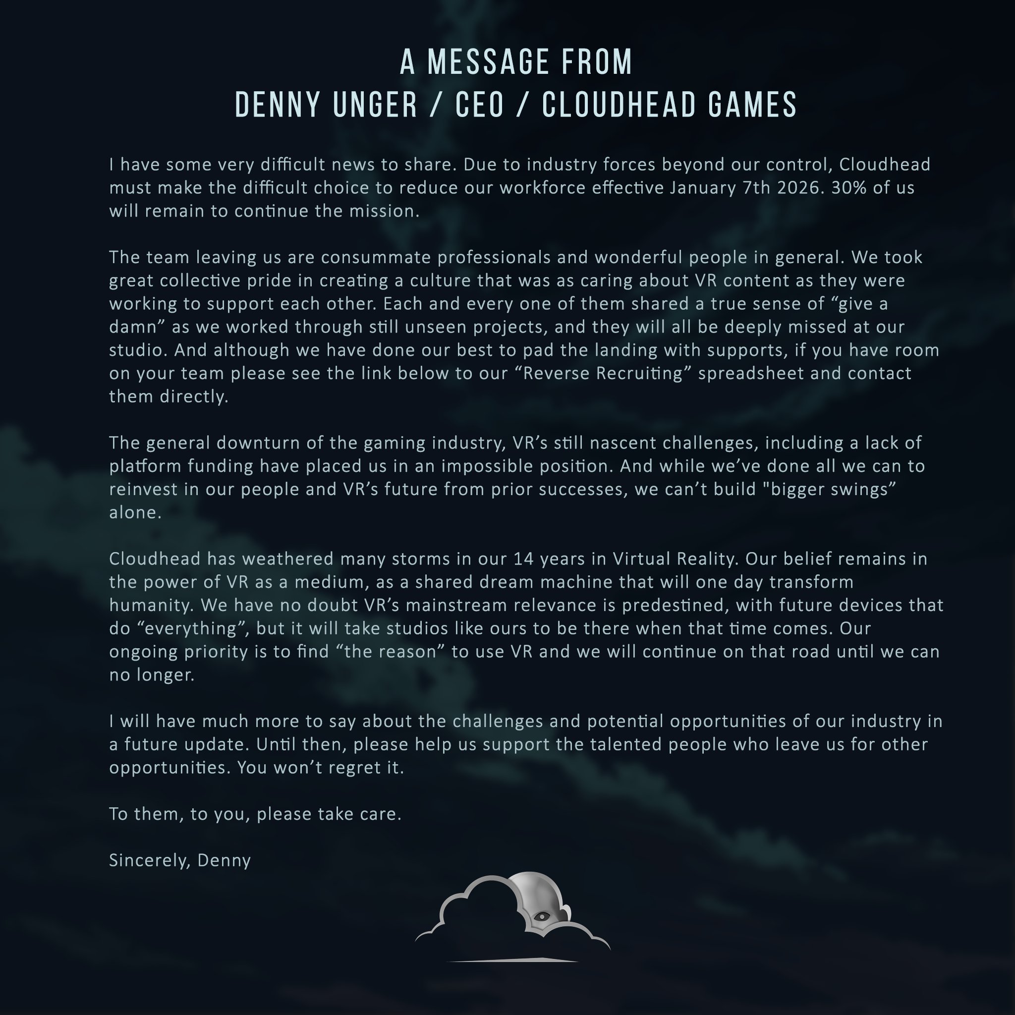J’ai des nouvelles très difficiles à partager. En raison de forces économiques indépendantes de notre volonté, Cloudhead doit prendre la décision difficile de réduire ses effectifs à partir du 7 janvier 2026. 30 % de notre équipe sera concernée, tandis que le reste de l’équipe poursuivra la mission.