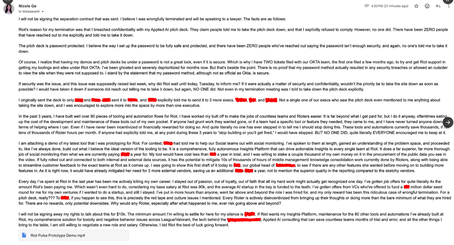 C’est précisément sur ce point que la version de Riot Games diverge, selon Nicole Ge. L’entreprise lui aurait reproché une violation des règles de confidentialité, en lien avec la manière dont le document a été stocké et partagé.