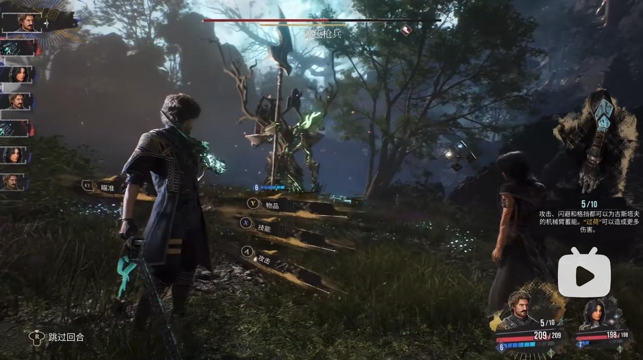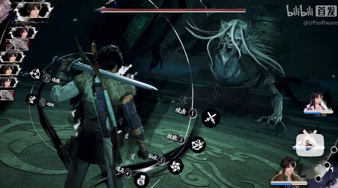 从《仙剑4重制版》现有预告演示画面观察,两作均采用将战斗指令嵌入场景并靠近角色位置呈现的方式,左侧设置队伍头像和行动序列信息,顶部设置敌方血条,右下角设置角色状态信息,整体信息架构在直观观感上存在一定相近之处。但需要说明的是,将菜单、指令提示从传统底部平铺菜单中抽离,改为更贴近角色或场景的沉浸式呈现,并非《33号远征队》独有的界面范式,在《女神异闻录》系列等作品中亦可见到将战斗指令与按键提示以更具场景融入感的方式组织与呈现的做法。因此,相关相似点首先更可能落在界面呈现思路与信息架构的层面,需进一步排除功能性与行业通用表达后再作著作权意义上的比对。