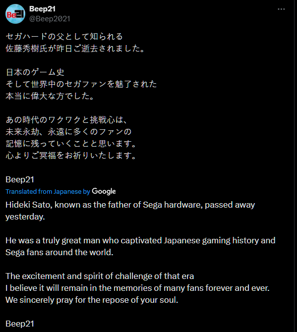 “Hideki Sato, known as the father of Sega hardware, passed away yesterday.”