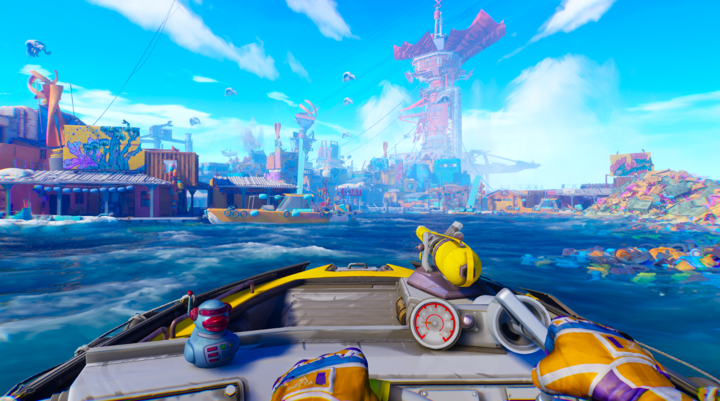 Dès les premières minutes, Tides of Tomorrow impose un décor fort : celui d’un monde submergé par une gigantesque montée des eaux. Cette “Grande Inondation” a transformé la planète en un océan quasi infini, où les survivants s’accrochent à des îlots de fortune ou dérivent à bord d’embarcations bricolées. Ce cadre post-apocalyptique n’est pas inédit en soi, mais le jeu lui apporte une identité visuelle marquée, presque paradoxale.