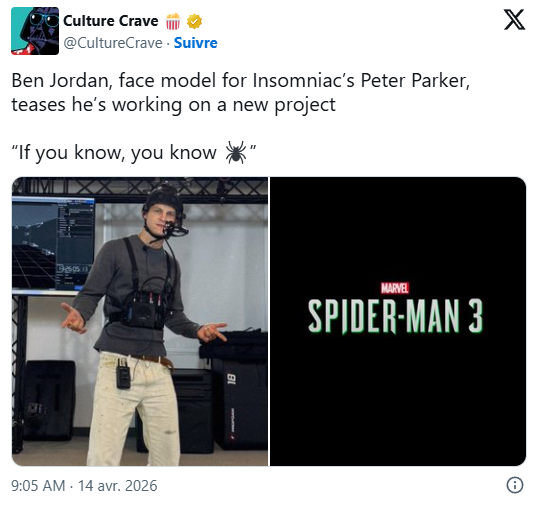 L’information tient en quelques secondes de story, mais son impact dépasse largement ce format éphémère. Ben Jordan, connu pour être le visage de Peter Parker dans les jeux Marvel’s Spider-Man d’Insomniac, a publié une photo de lui sur ce qui semble être un plateau de tournage. Jusque-là, rien d’exceptionnel pour un acteur habitué à la motion capture. Mais c’est la légende qui a immédiatement attiré l’attention : « If you know, you know », accompagnée d’un emoji d’araignée.